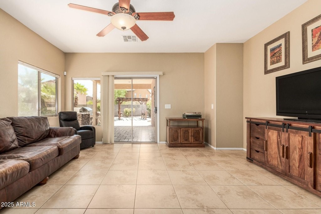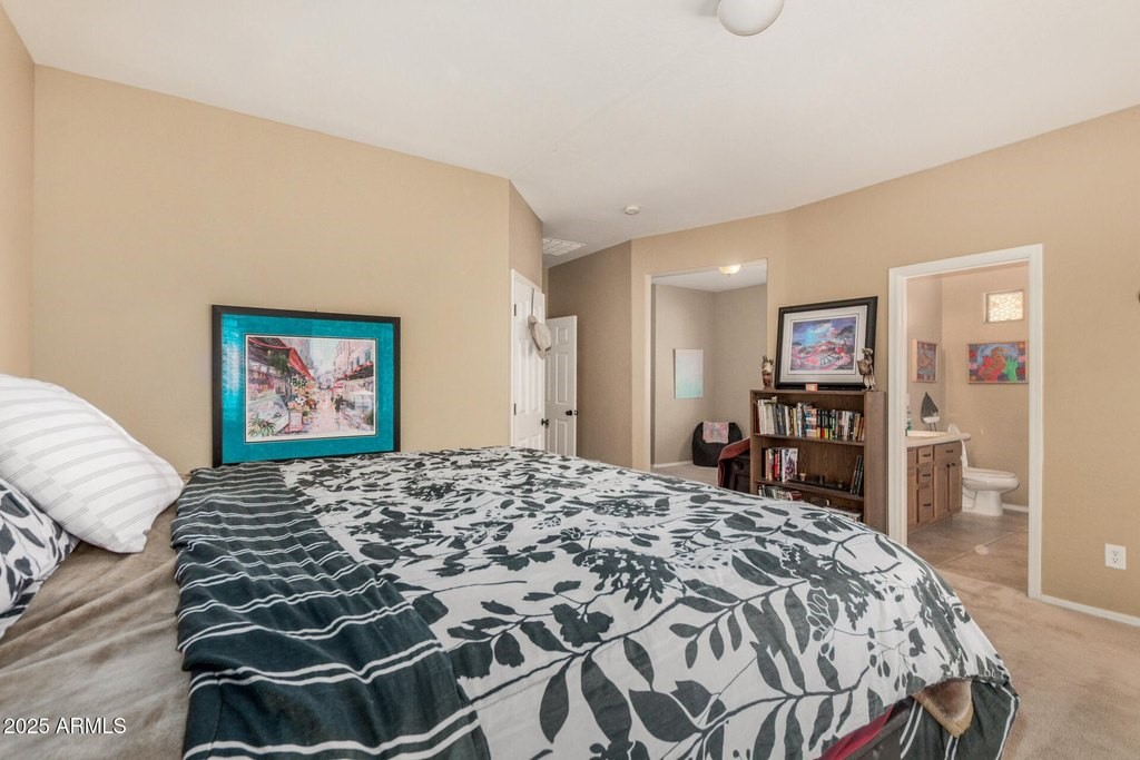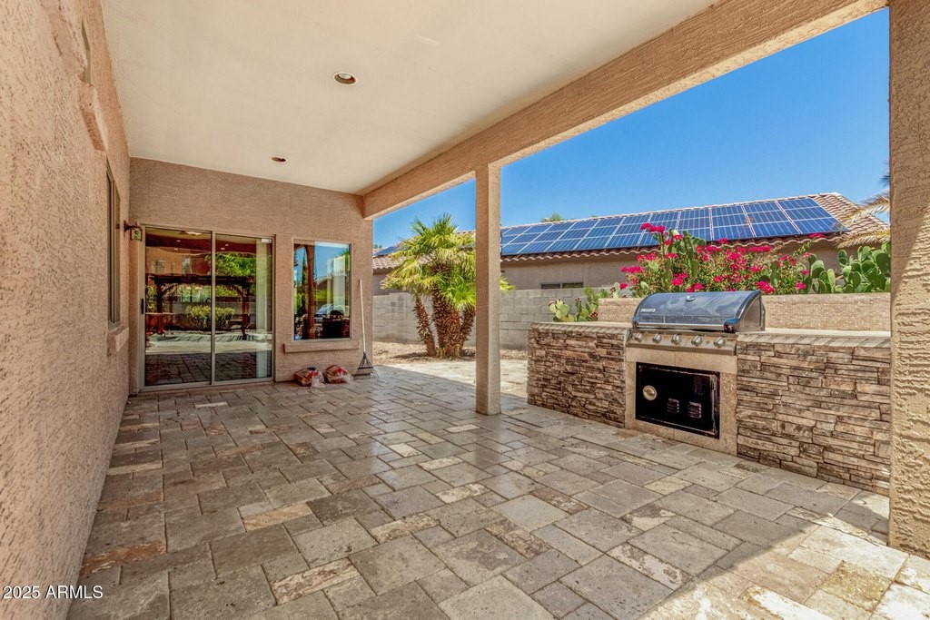 Welcome to this beautiful home in the Villages at Rancho El Dorado on a 1/4 acre cul-de-sac lot! The inviting interior showcases tons of natural light and neutral 2-tone paint. The eat-in kitchen boasts built-in appliances, granite counters, travertine backsplash, recessed lighting, and plenty of cabinets. The peninsula has a breakfast bar adjacent to the great room for additional dining space. You'll love the main bedroom with a bay window and attached sitting room. Its ensuite has dual sinks, separate tub/shower, & a walk-in closet. Washer/dryer set included. The HUGE backyard features a covered patio, built-in BBQ grill, travertine pavers, and a pergola. And the community amenities are the best in Maricopa, with a pool, clubhouse, fitness center, walking trails and pickleball courts.